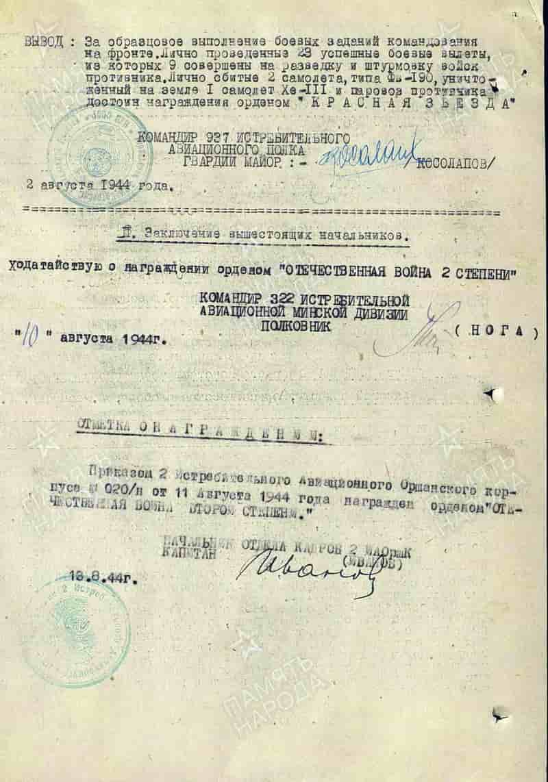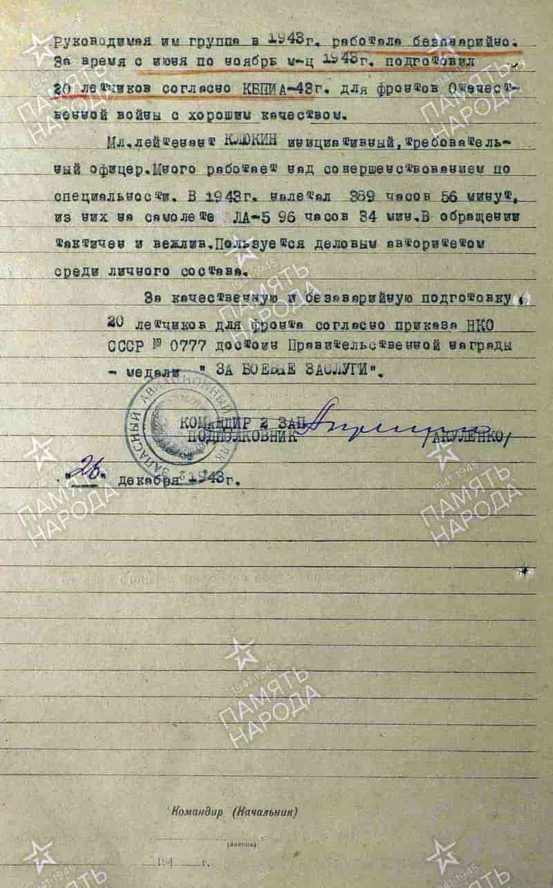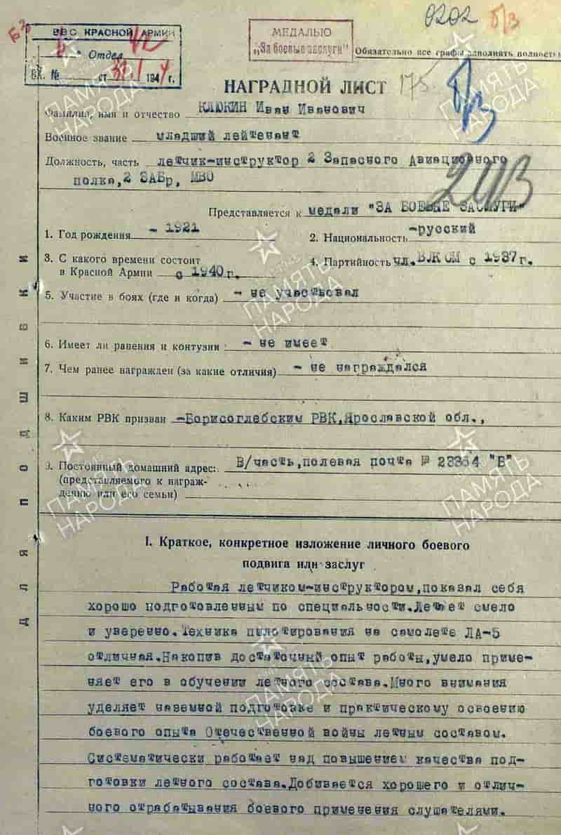 26.12.1943 лётчик-инструктор 2-го запасного иап младший лейтенант Клюкин И.И. представлен к награде и 02.08.1944 награждён медалью «За боевые заслуги».