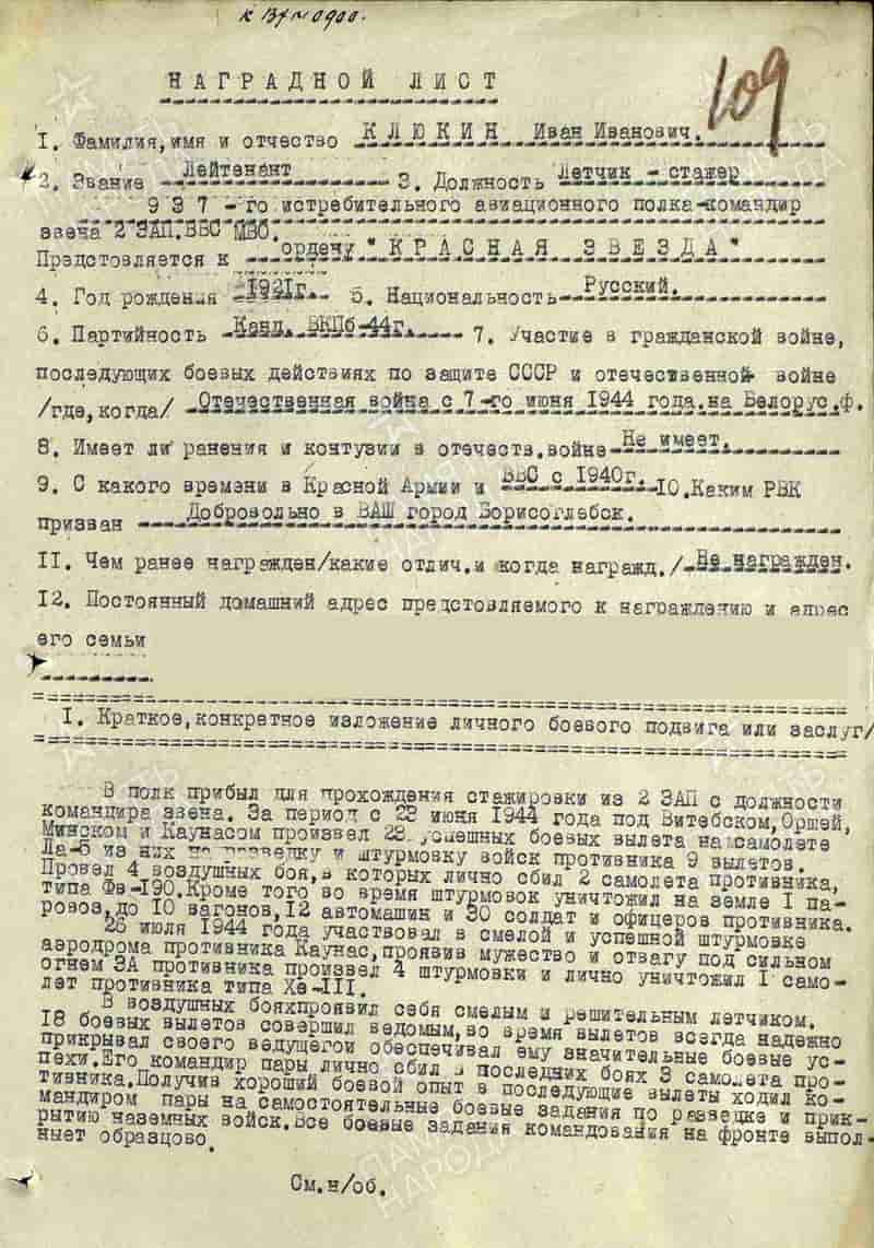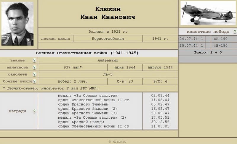 02.08.1944 лётчик-стажёр 937 иап, командир звена 2-го запасного иап ВВС Московского ВО, лейтенант Клюкин И.И. представлен к награждению орденом Красной Звезды. 11.08.1944 награждён орденом Отечественной войны II степени.