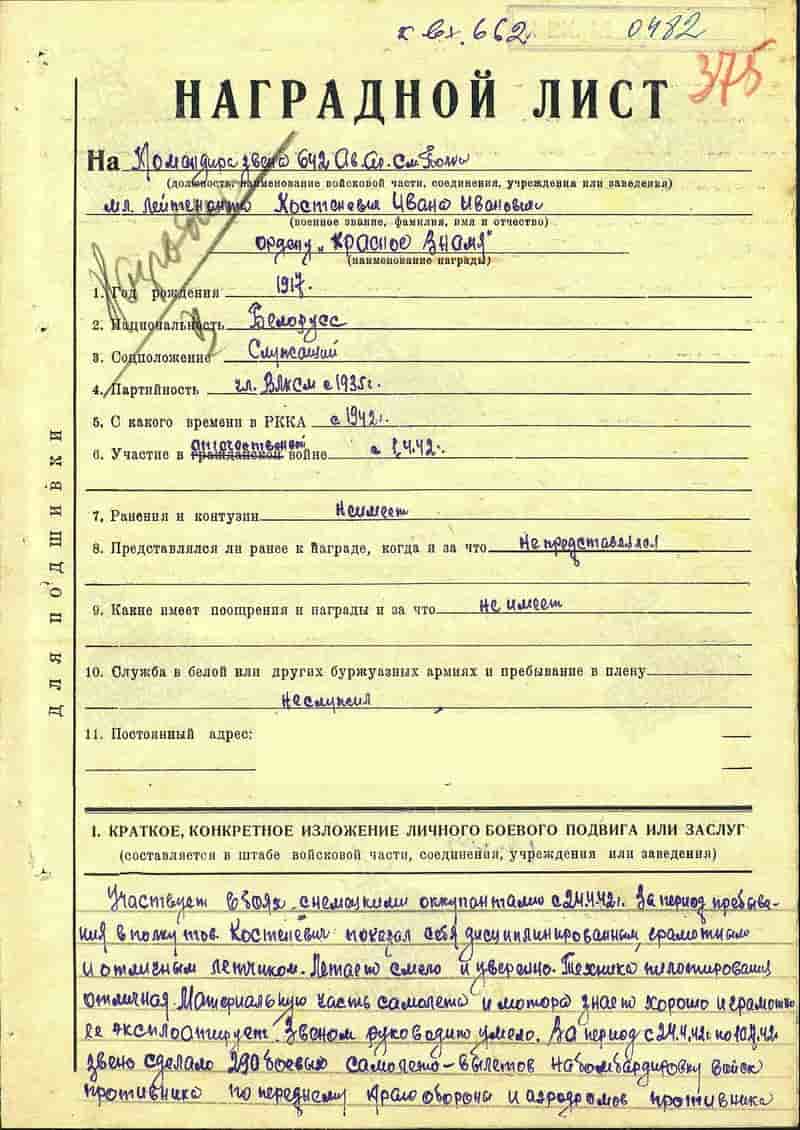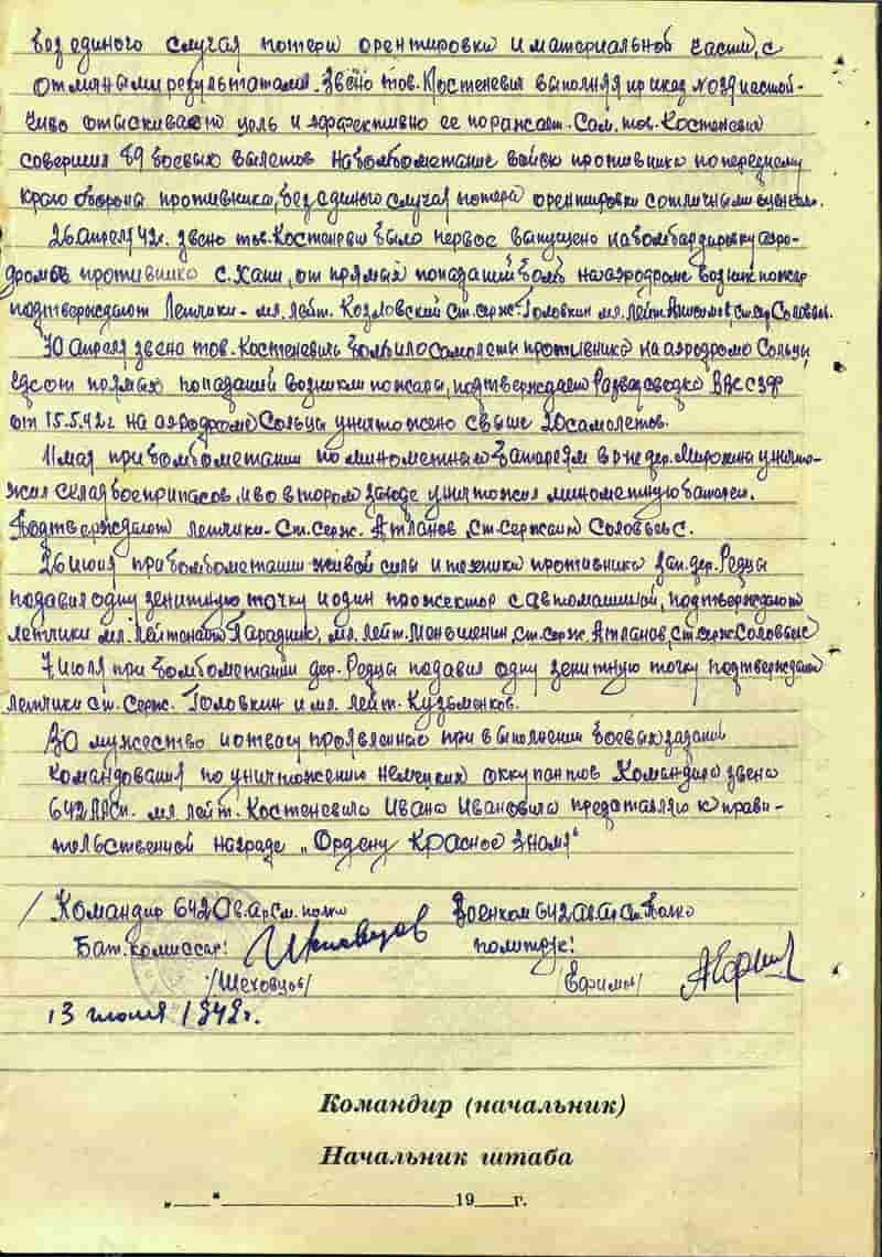 13.07.1942 командир звена 642-го сап младший лейтенант Костеневич И.И. представлен к награде и 18.08.1942 награждён орденом Красного Знамени.