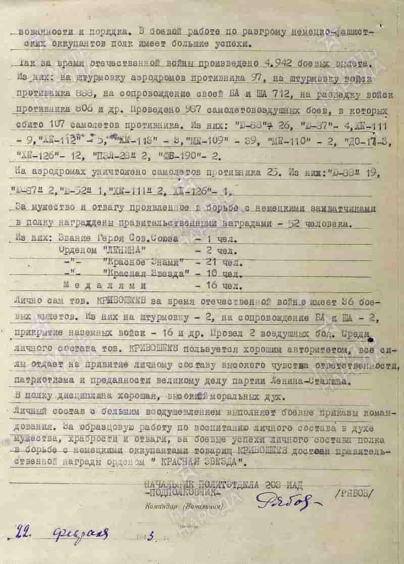 22.02.1943 заместитель командира по политчасти 20 иап майор Кривошеев В.П. представлен к награде и 18.04.1943 награждён орденом Красной Звезды.