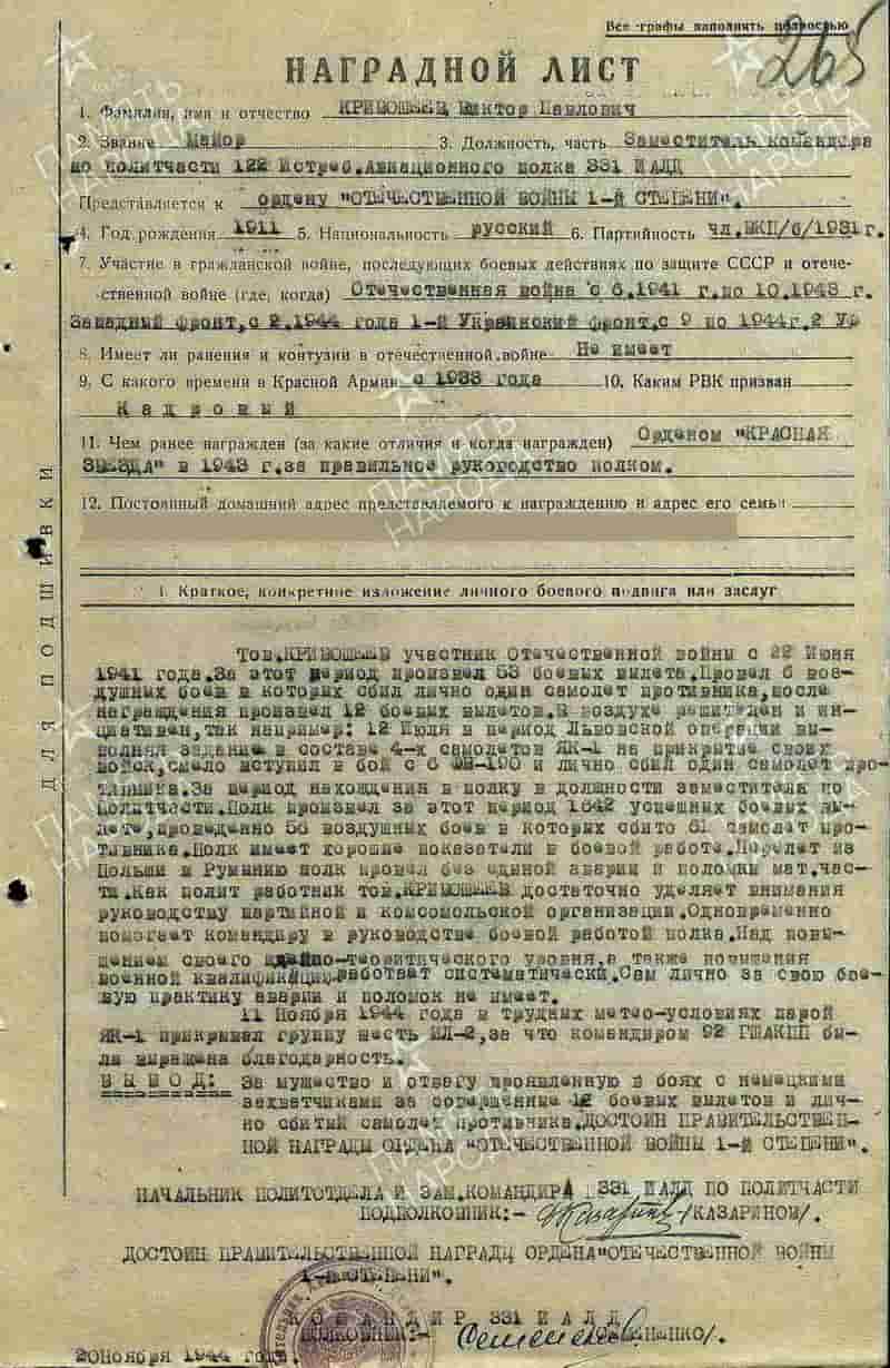 20.11.1944 заместитель командира по политчасти 122 иап майор Кривошеев В.П. представлен к награде и 17.01.1945 награждён орденом Отечественной войны I степени.