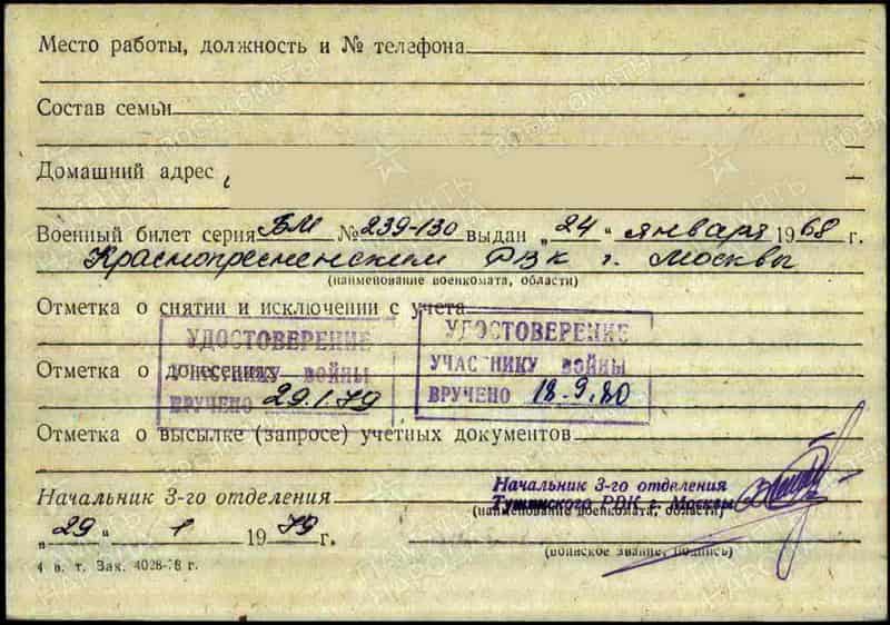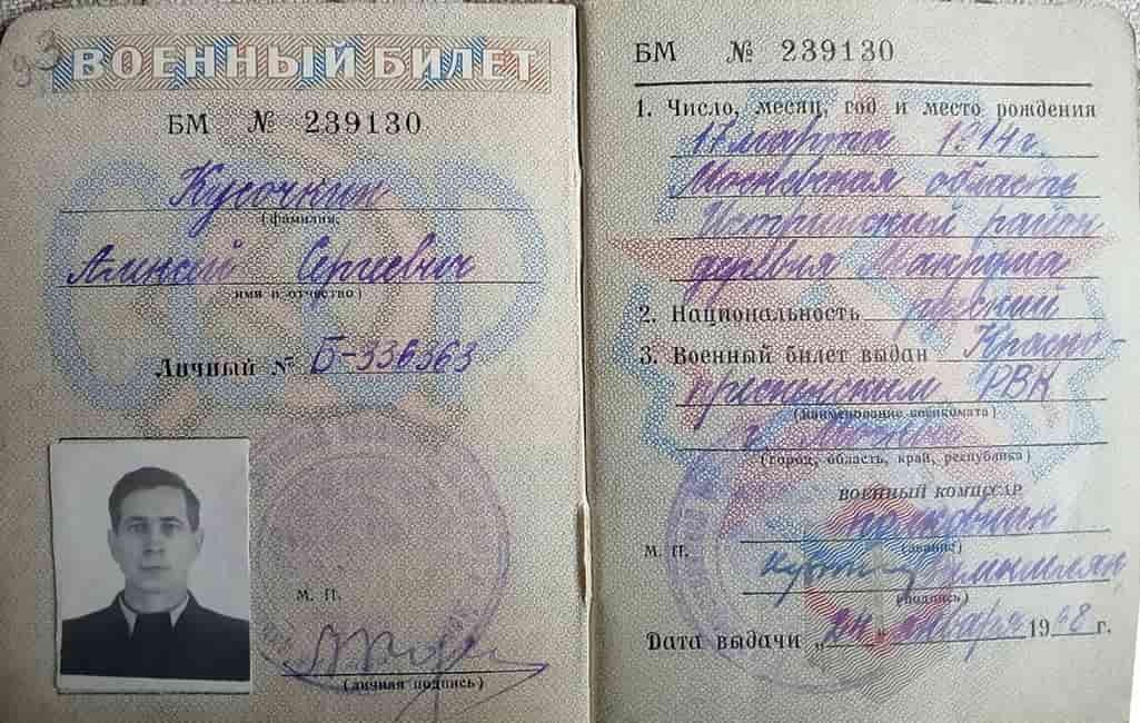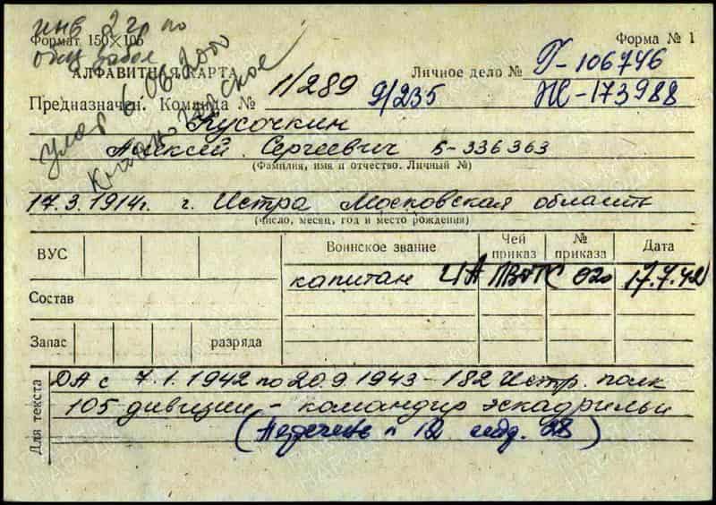19.01.1946 гвардии капитан Кусочкин Алексей Сергеевич уволен в запас и состоял на воинском учёте в Краснопресненском РВК г. Москвы.