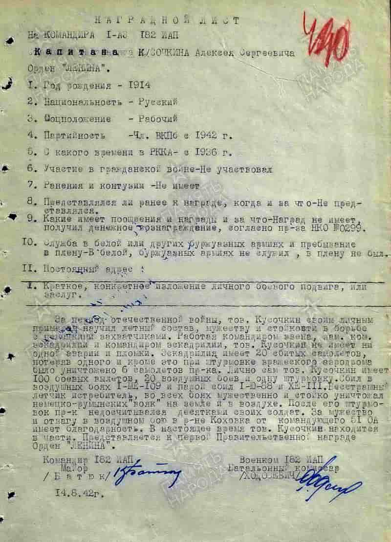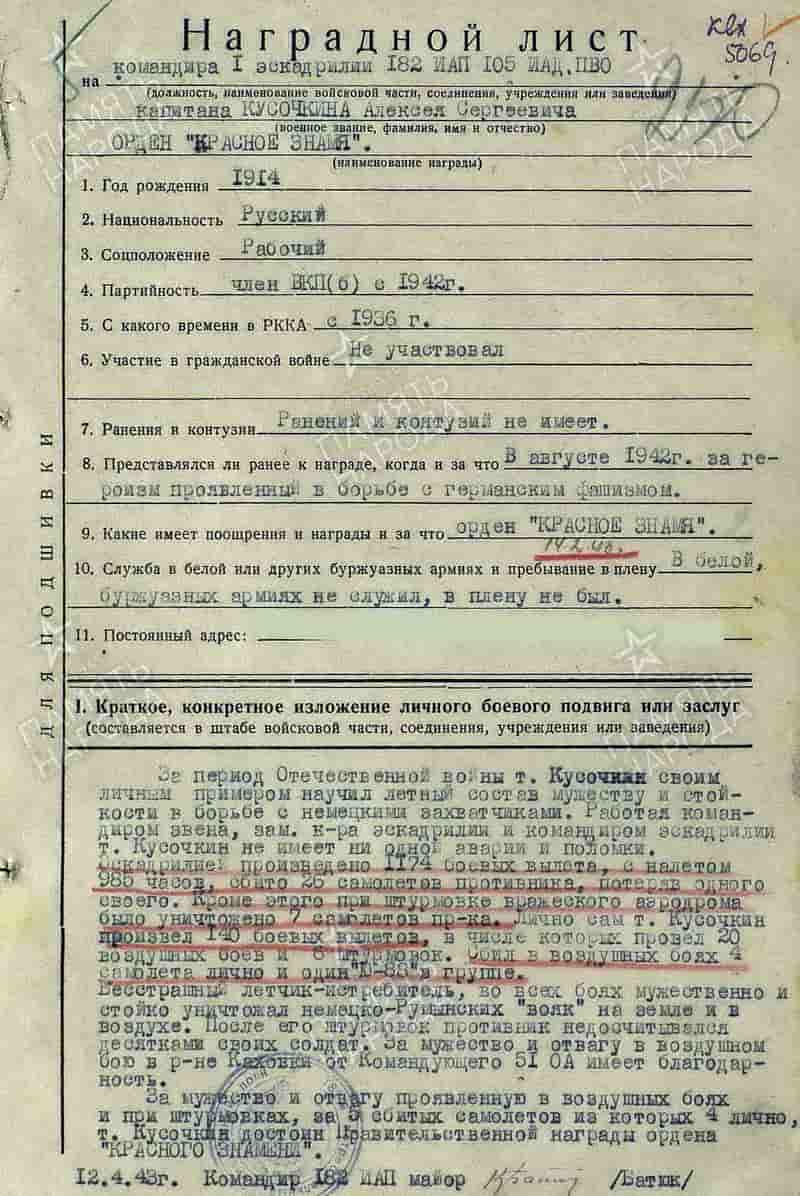 12.04.1943 командир 1-й эскадрильи 182 иап ПВО 105 иад ПВО капитан Кусочкин А.С. представлен к награде и 24.04.1943 награжден орденом Красного Знамени.
