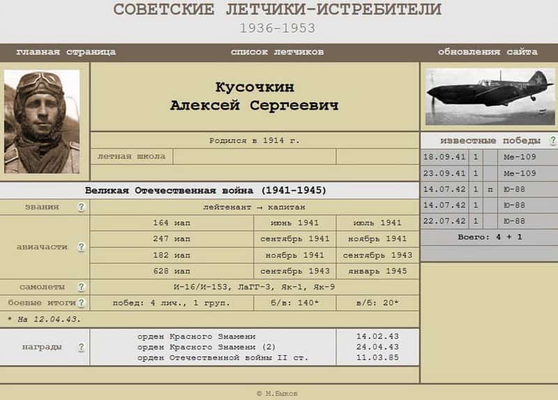 По уточнённым данным капитан Кусочкин А.С. за время войны сбил 4 самолёта противника и 4 в составе группы.