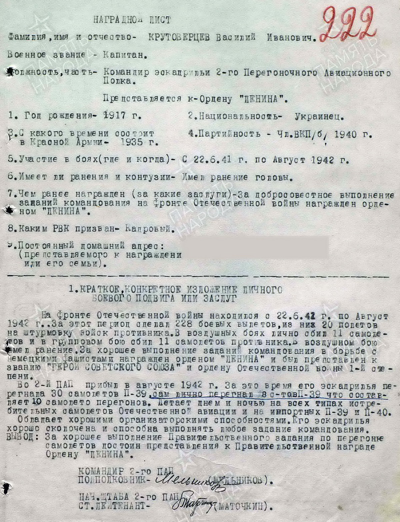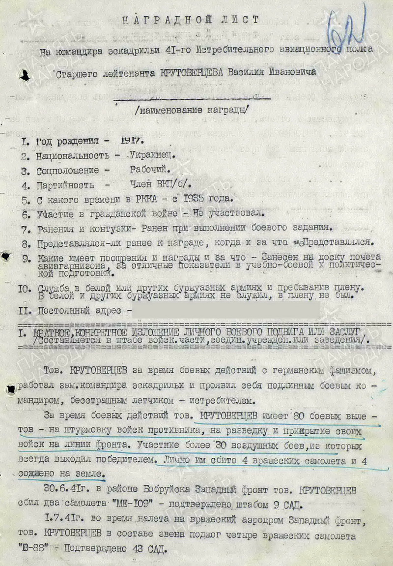15.02.1942 командир эскадрильи 41 иап 2-й резервной авиационной группы 59-й армии Волховского фронта старший лейтенант Крутоверцев В.И. представлен к награде и 20.04.1942 награждён орденом Ленина.