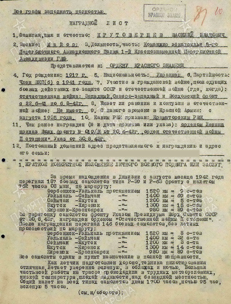 15.03.1945 командир эскадрильи 5-го перегоночного авиаполка 1-й Краснознамённой дивизии ГВФ майор Крутоверцев В.И. представлен к награде и 18.08.1945 награждён орденом Красного Знамени.