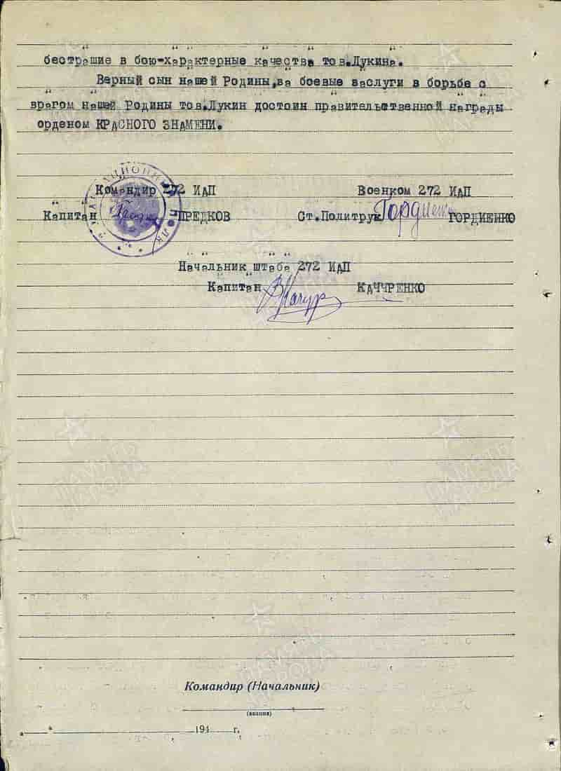 В середине июля 1942 года заместитель командира эскадрильи 272-го иап младший лейтенант Лукин П.А. представлен к награде и 23.07.1942 награждён орденом Красного Знамени.