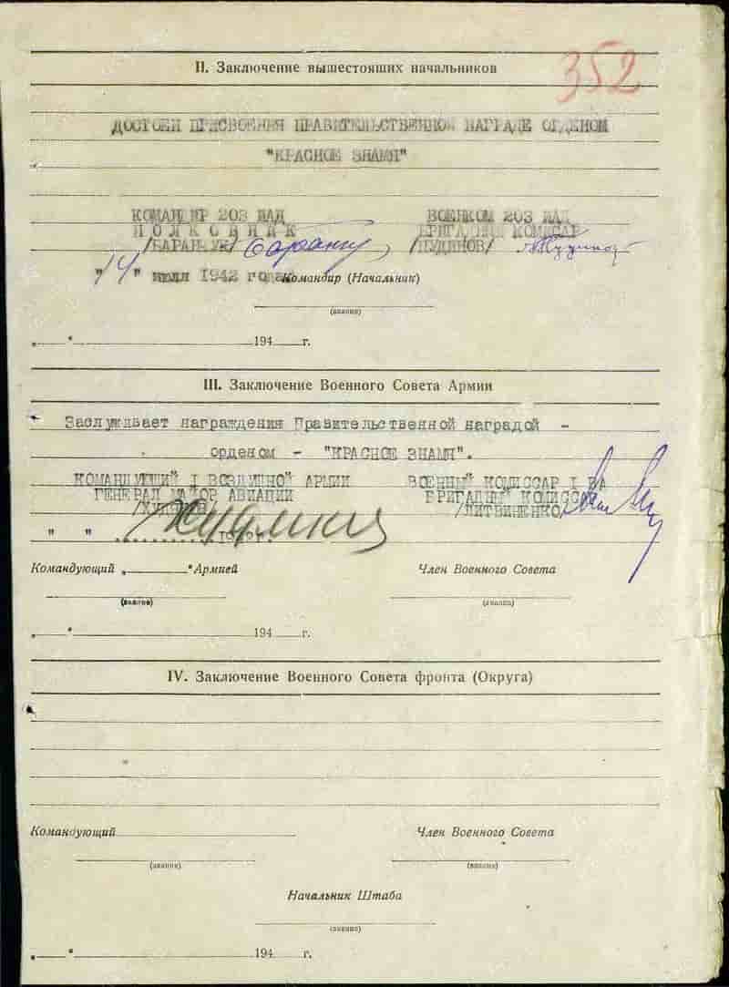 29.07.1942 присвоено воинское звание лейтенант и утверждн в должности заместителя командира эскадрильи 272 иап 203 иад 1-й ВА Западного фронта.