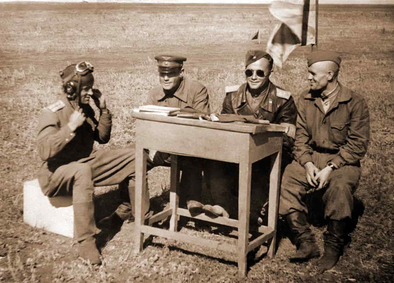 Лагерь Танцирей, 1946 год. Слева направо: командир звена Куда, заместитель командира аэ Титов, командир аэ Лапшин Н.Г., командир звена Луценко К.М.
