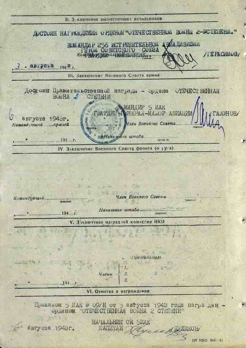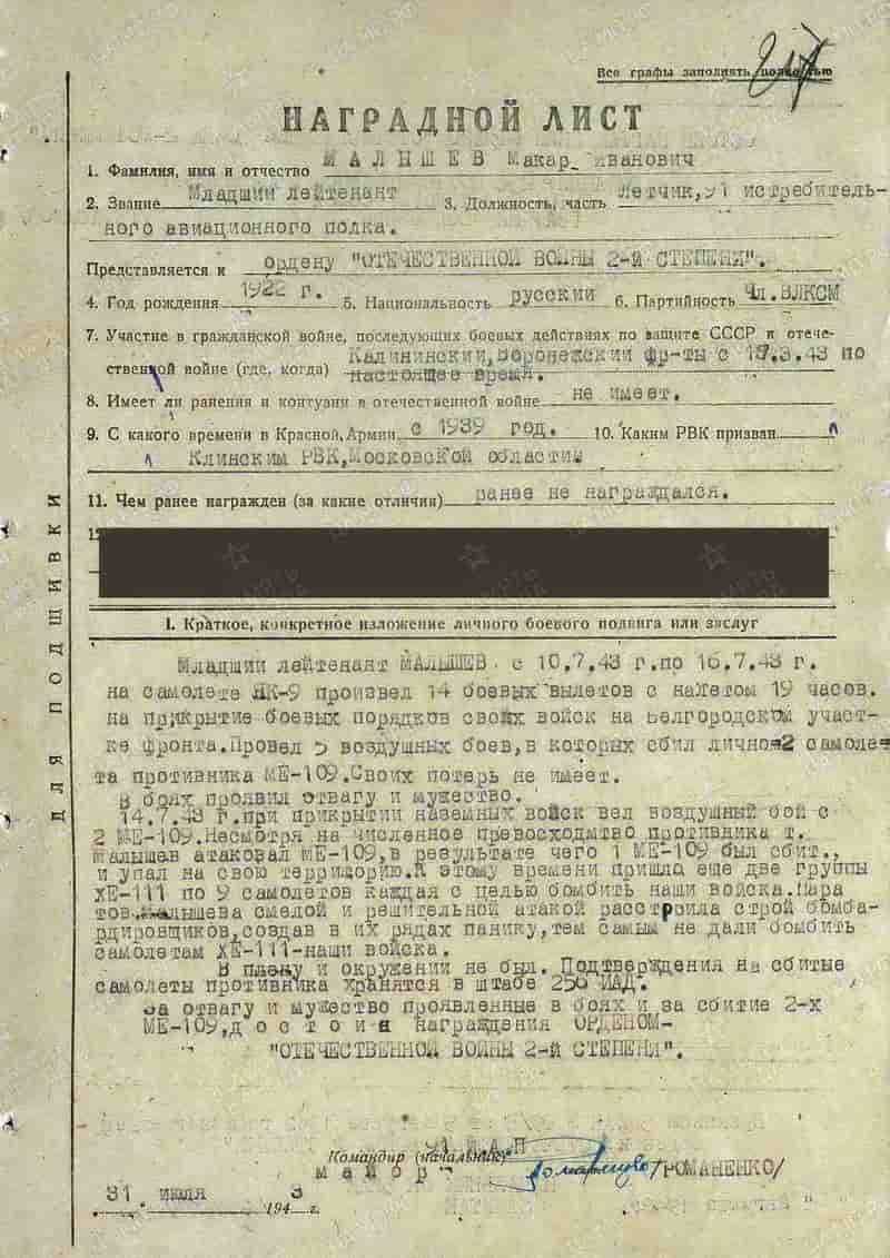 31.07.1943 лётчик 91 иап младший лейтенант Малышев М.И. представлен к награде и 08.08.1943 награждён орденом Отечественной войны II степени.