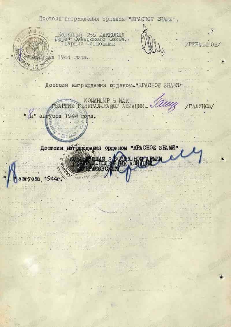 03.08.1944 заместитель командира, штурман эскадрильи 91 иап 256 иад 5 иак 2 ВА 1-го Украинского фронта лейтенант Малышев М.И. представлен к награде и 18.08.1944 награждён орденом Красного Знамени.
