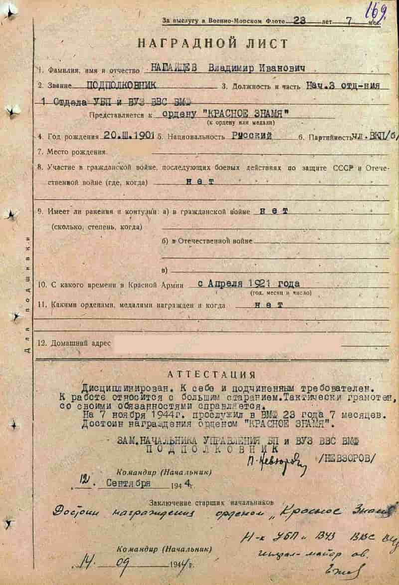 12.09.1944 начальник 3-го отделения 1-го отдела УБП и ВУЗ ВВС ВМФ подполковник Нагайцев В.И. представлен к награде и 03.11.1944 награждён орденом Красного Знамени.