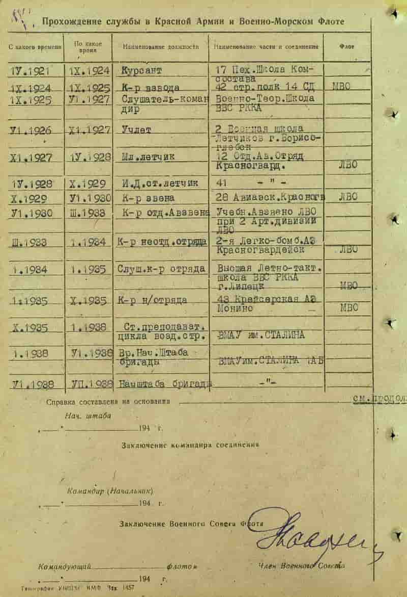 20.10.1927 (21-й выпуск) окончил обучение, после чего назначен младшим лётчиком 12-го отдельного авиационного отряда 1-й авиационной бригады ВВС Ленинградского ВО в г. Троцке (ныне Гатчина) Ленинградской области.
