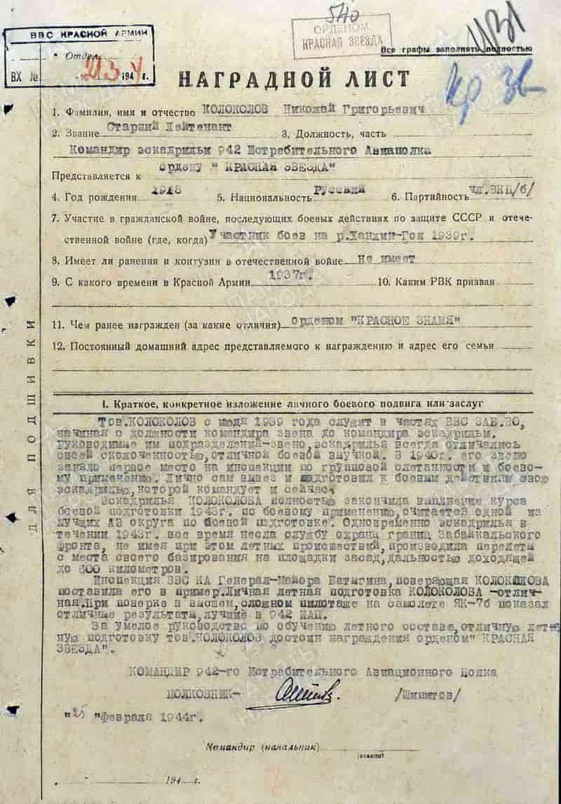 25.02.1944 командир эскадрильи 942 иап 248 шад 12-й ВА Забайкальского фронта старший лейтенант Колоколов Н.Г. представлен к награде и 02.08.1944 награждён орденом Красной Звезды.
