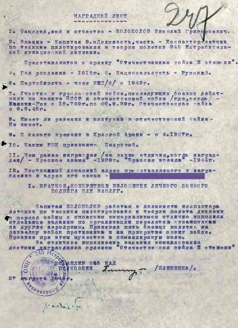 27.08.1945 инспектор-лётчик по технике пилотирования и теории полётов 245 иад 12-й ВА Забайкальского фронта капитан Колоколов Н.Г. представлен к награде и 28.08.1945 награждён орденом Отечественной войны II степени.