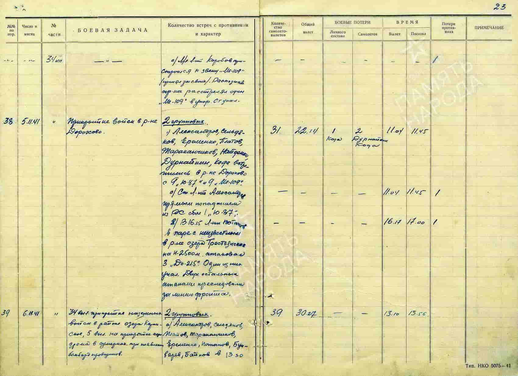 «...На следующий день, прикрывая наши войска в районе Дорохова, вновь восьмёрка истребителей, в составе которой, как и накануне, отец, Александров, Ерёмин, Платов, а также Сельдяков, Тараканчиков, Дурнайкин и Кода, встретила 9 бомбардировщиков Ю-87 под защитой 9 истребителей Ме-109: