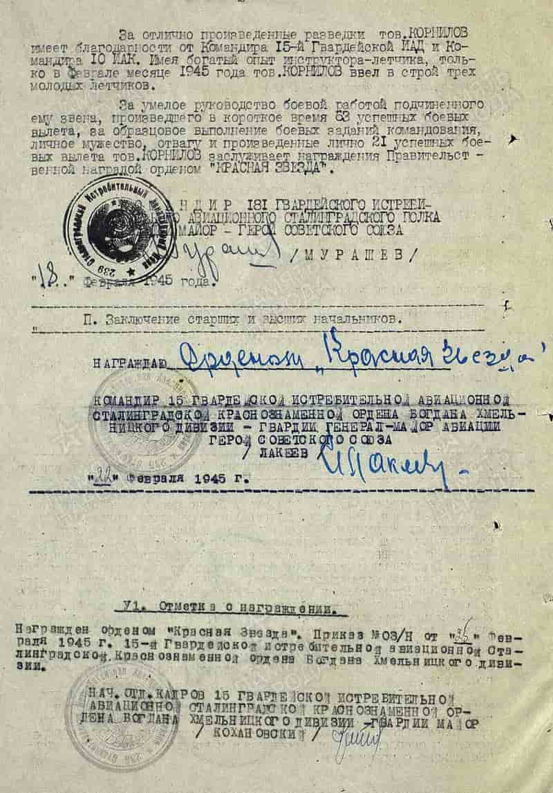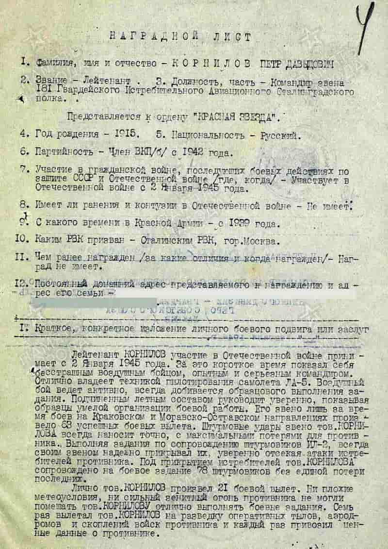 22.02.1945 командир звена 181 гвардейского иап лейтенант Корнилов П.Д. представлен к награде и 25.02.1945 награждён орденом Красной Звезды.