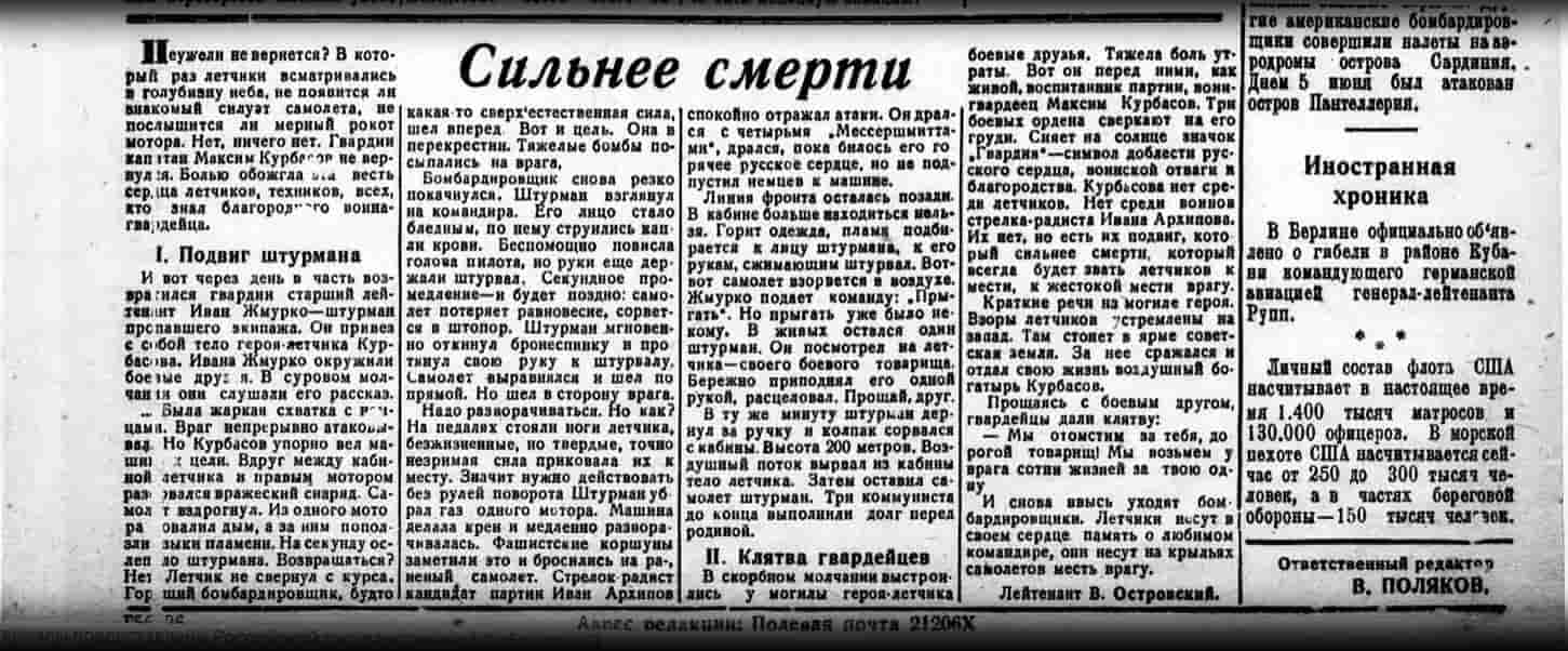 «Неужели не вернётся? В который раз лётчики всматривались в голубизну неба, не появится ли знакомый силуэт самолёта, не послышится ли мерный рокот мотора. Нет, ничего нет. Экипаж гвардии капитана Максима Курбасова не вернулся. Болью обожгла эта весть сердца лётчиков, техников.