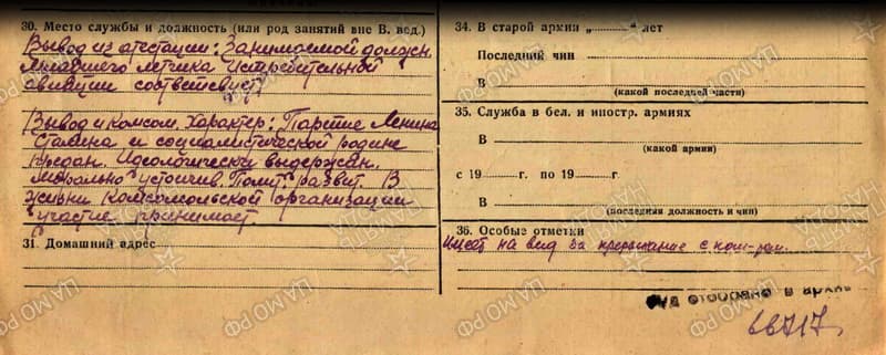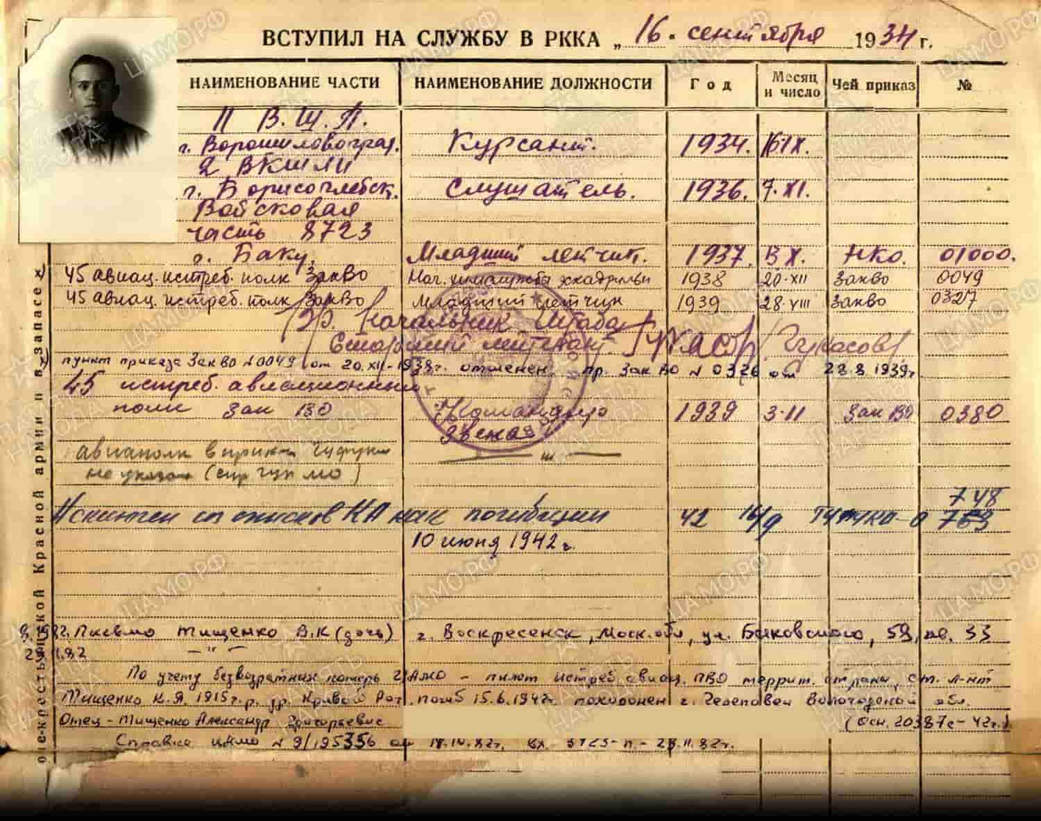 13.10.1937 направлен для дальнейшего прохождения службы в в/ч 8723 (г. Баку) на должность младшего лётчика.
