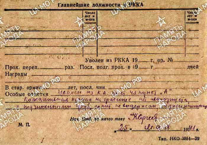 Приказом НКО № 04915 от 02.11.1940 уволен в запас по ст.43 пункт "А":