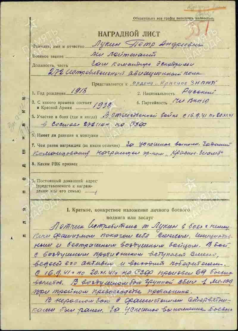 В феврале 1942 г. командир звена 272-го иап младший лейтенант Лукин П.А. представлен к награде и 16.04.1942 награждён орденом Красного Знамени.