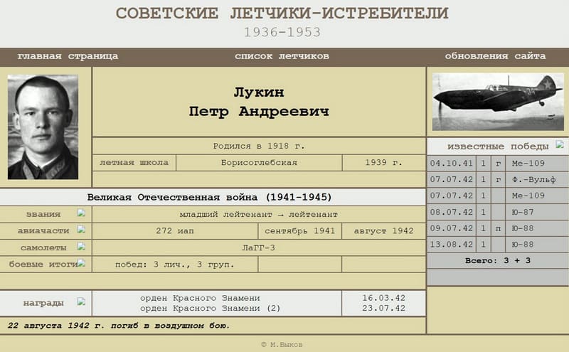 22.08.1942 заместитель командира эскадрильи 272 иап лейтенант Лукин Пётр Андреевич погиб в воздушном бою на самолёте ЛаГГ-3.