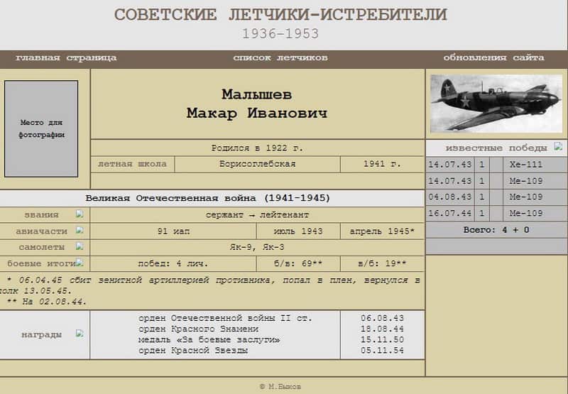 «...Доложили командиру, который решил отправить на штурмовку составов пару — Толю Малышева [Малышев Макар Иванович, лейтенант. Воевал в составе 91-го иап. Всего за время участия в боевых действиях в воздушных боях лично сбил 6 самолетов противника] с Витькой Альфонским. Мы им все рассказали. Подходит Малышев к своему самолету и как-то странно себя ведет. Я ему говорю: «Что ты, Толя?» — «Я что-то чувствую. Знаешь, вспомнилось, как горел на Курской дуге». Я ему говорю: «Толя, брось ты! Ни пуха тебе, ни пера!». Полетели они на своих Як-3. Час проходит. Погода становится все хуже и хуже. Через некоторое время раздался гул мотора, и один «як» пошел на посадку. Вернулся Альфонский. От него мы узнали, что пошли они по нашему маршруту на железнодорожный узел. Знали от нас, что там не стреляют. Первый заход сделали под углом к составам, чтобы как можно дольше быть над целью. Стали уходить — все, что могло с земли стрелять, все по ним открыло огонь. Малышеву снаряд попал в распределительный бачок. Альфонский говорил, что видел, как от его самолета пошли белые, а затем черные струи. Толя стал задыхаться, фонарь открыл. (Летали ведь с закрытым фонарем. Приучались к этому. К слову, приучаться приходилось и к рации, ведь поначалу ими не пользовались. Когда ввели звания: летчик-радист 3-го класса, 2-го, 1-го, летчик-радист-мастер, за которые доплачивали, стали ими пользоваться). И вот Толя фонарь открыл. А надо сказать еще, что мы летали в немецких сеточках. Мы их под Бригом захватили. А то ведь в наших шлемофонах голова потеет и волосы выпадают. Даже шелковые подшлемники не спасали. Пламя перекинулось Малышеву на голову. Альфонский ему кричал: «Толька, тяни!!!» Километров 15 до линии фронта оставалось, а высота метров 900. Но, видимо, сил терпеть у него уже не было. Он перевернул самолет и выбросился. Метров 500 до своих не дотянул. Попал в плен и вернулся в полк 13 мая.