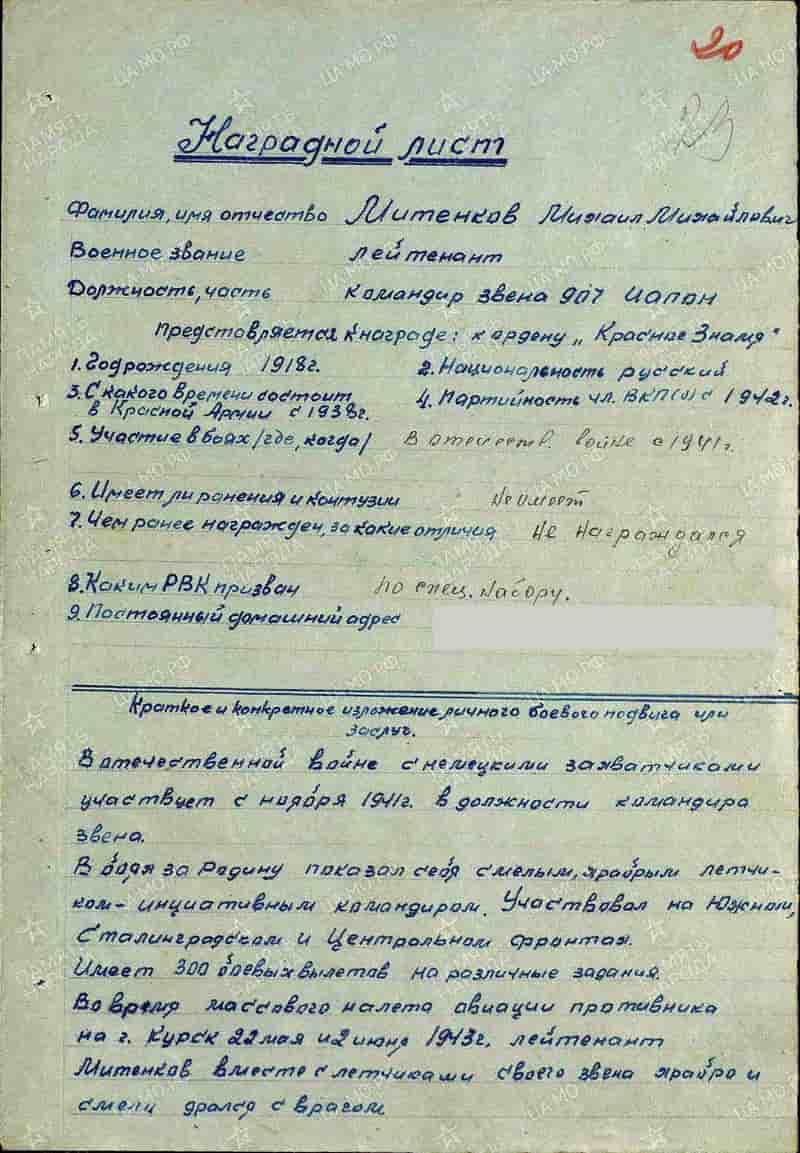 18.07.1943 командир звена 907 иап он 9 иак ПВО Западного фронта ПВО гвардии лейтенант Митенков М.М. представлен к награде и 01.08.1943 награждён орденом Красного Знамени.