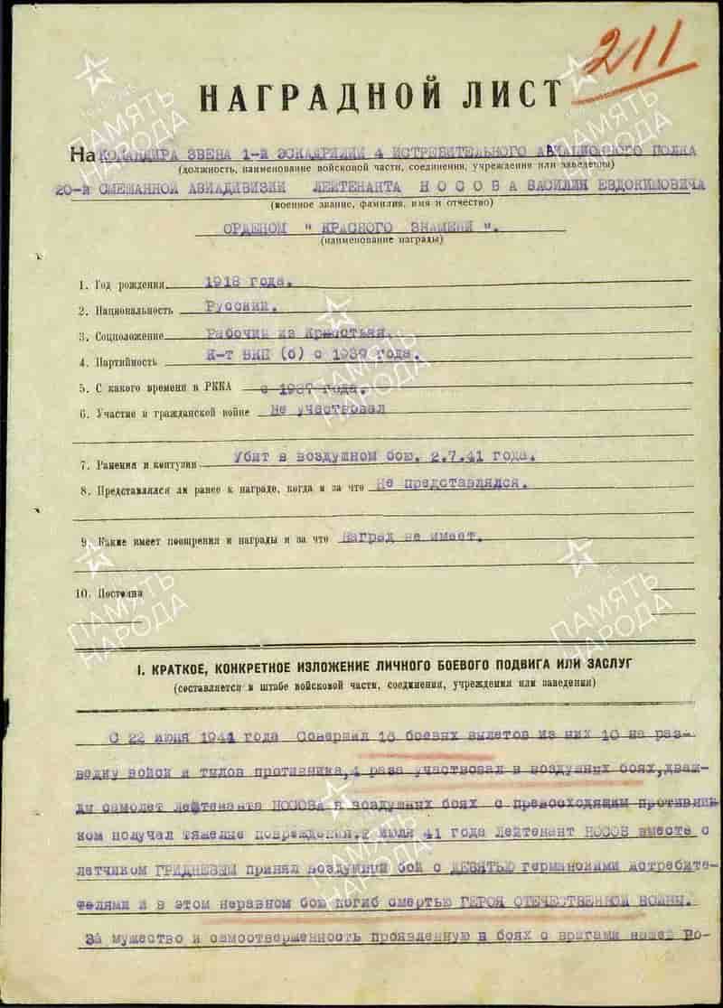 17.07.1941 командир звена 4-го иап лейтенант Носов В.Е посмертно представлен к награде и 05.11.1941 награждён орденом Красного Знамени.