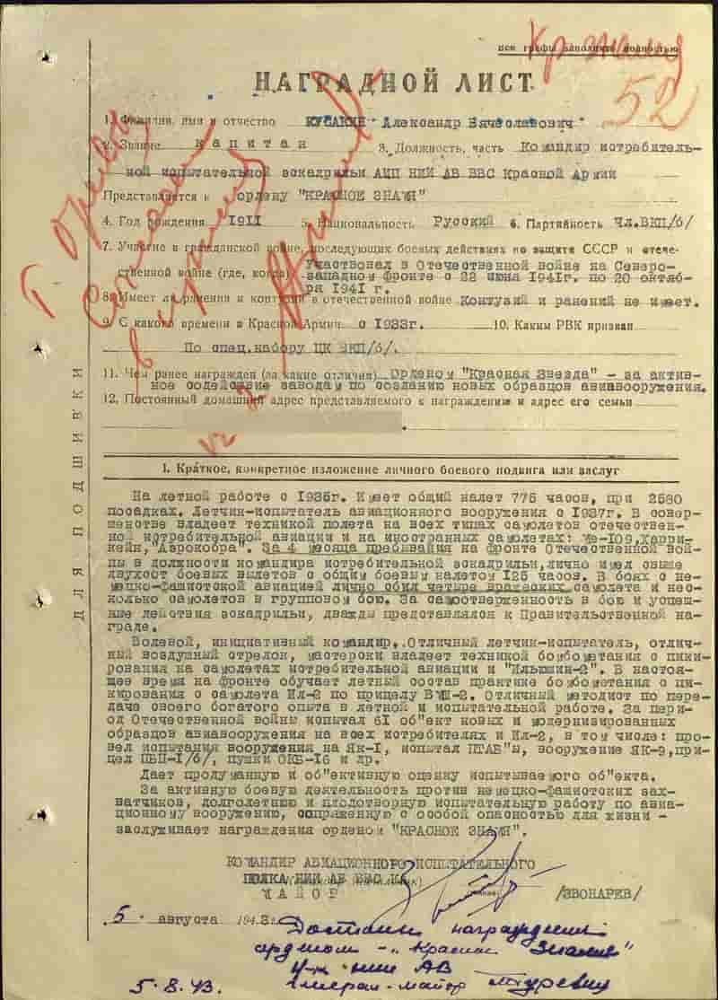 05.08.1943 командир истребительной испытательной эскадрильи АИП НИИ АВ ВВС Красной армии капитан Кусакин А.В. представлен к награждению орденом Красного Знамени.