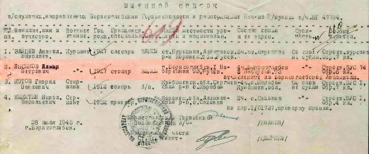 28.07.1945 Борисоглебским Горвоенкоматом (подполковником Ивановым) направлен в распоряжение начальника распределительного пункта в/ч пп 47784 (в/ч 47784 – 16 запасная стрелковая бригада/дивизия. Место дислокации с ранней осени 1943 года - г. Борисоглебск. Задача - подготовка маршевых рот для восполнения потерь на фронте).