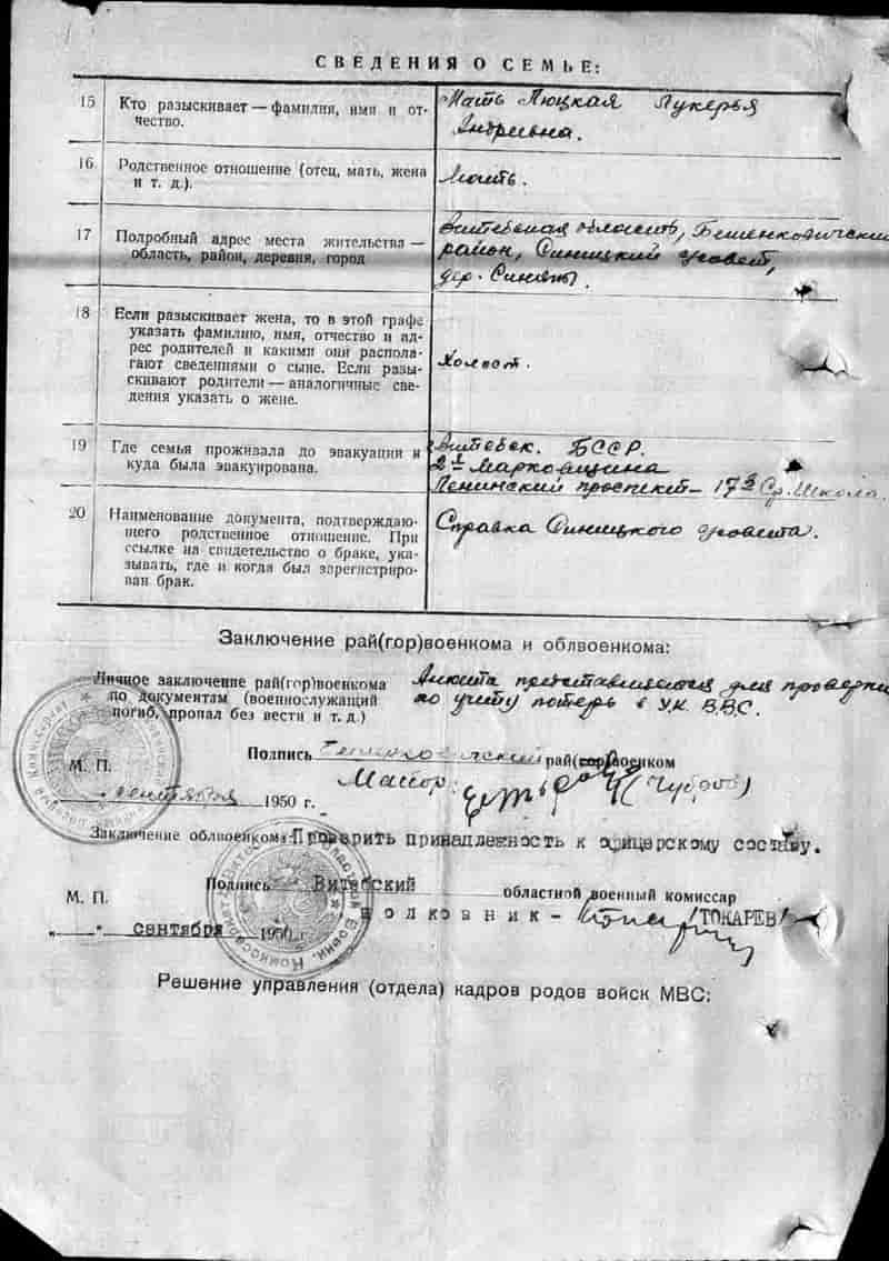 На запрос Бешенского райвоенкомата в УСУ ГУК ВС от 29.07.1948 ответа не было получено.