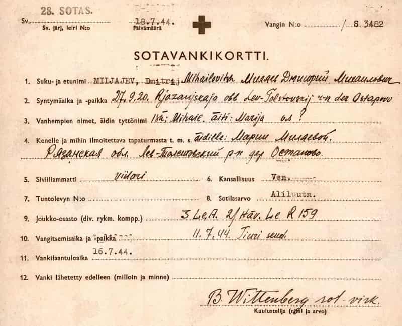 В действительности попал в плен в районе посёлка Тиури (Tiuri) Финляндия (с 1948 года – посёлок Васильево в Мельниковском сельском поселении Приозерского района Ленинградской области). Находился в лагере, военном госпитале 28, Коккола. Лагерный номер S-3482.
