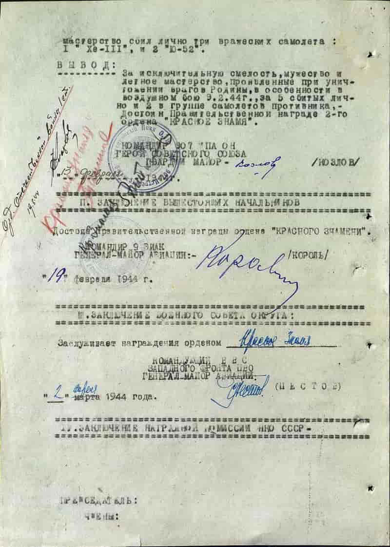 13.02.1944 командир звена 2-й эскадрильи 907 иап он 9 иак ПВО Западного фронта ПВО гвардии лейтенант Митенков М.М. представлен к награде и 19.04.1944 награждён орденом Красного Знамени.