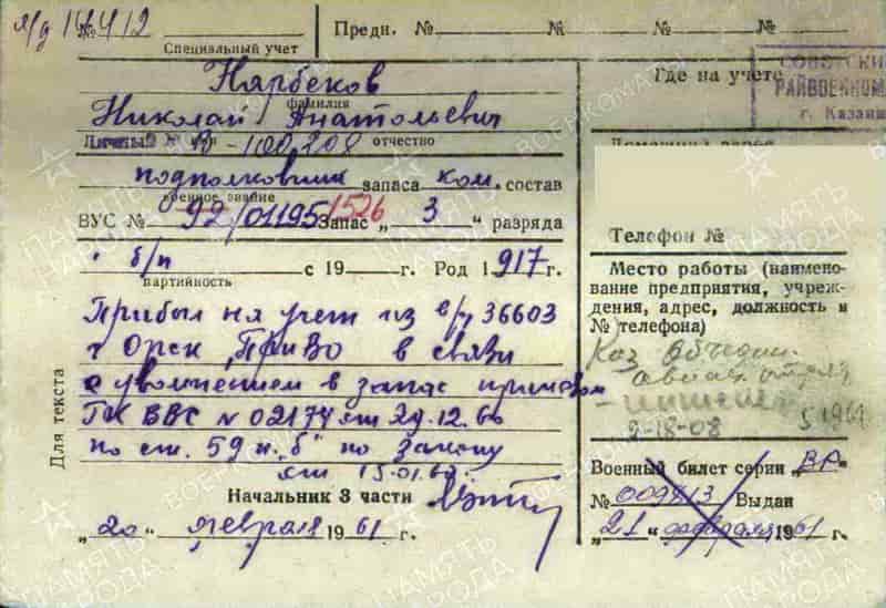 29.12.1960 подполковник Нарбеков Николай Анатольевич уволен в запас (приказ ГК ВВС № 02174 от 29.12.1960 по ст. 59 п. «б»).